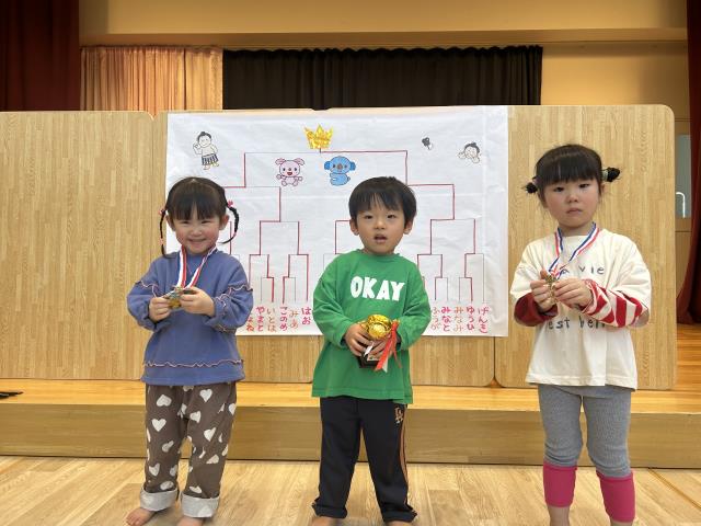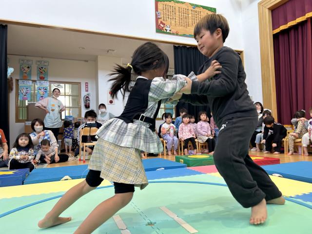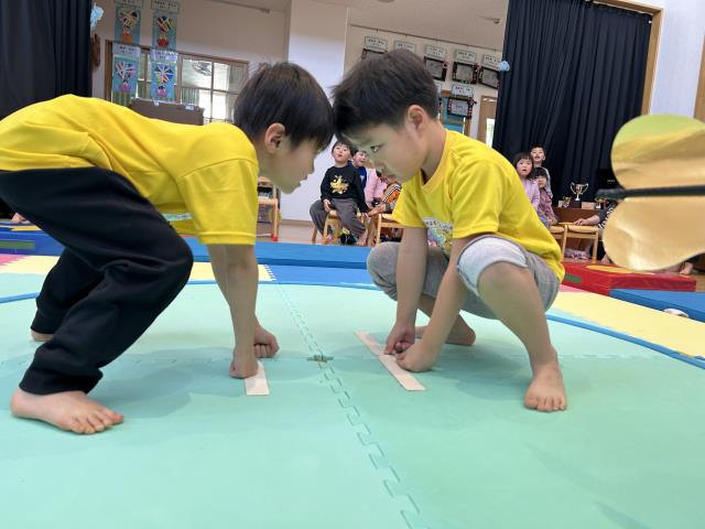 | 毎年恒例のお相撲大会が開かれました。未満児部門、以上児部門に分かれ、この日まで頑張って練習してきた力を存分に発揮する日でした。年齢が上がるにつれて、子ども同士の熱い戦いが繰り広げられ、勝って喜ぶ子、負けて泣いて悔しがる子…様々でしたが、最後まで頑張って参加することができました。 | ||