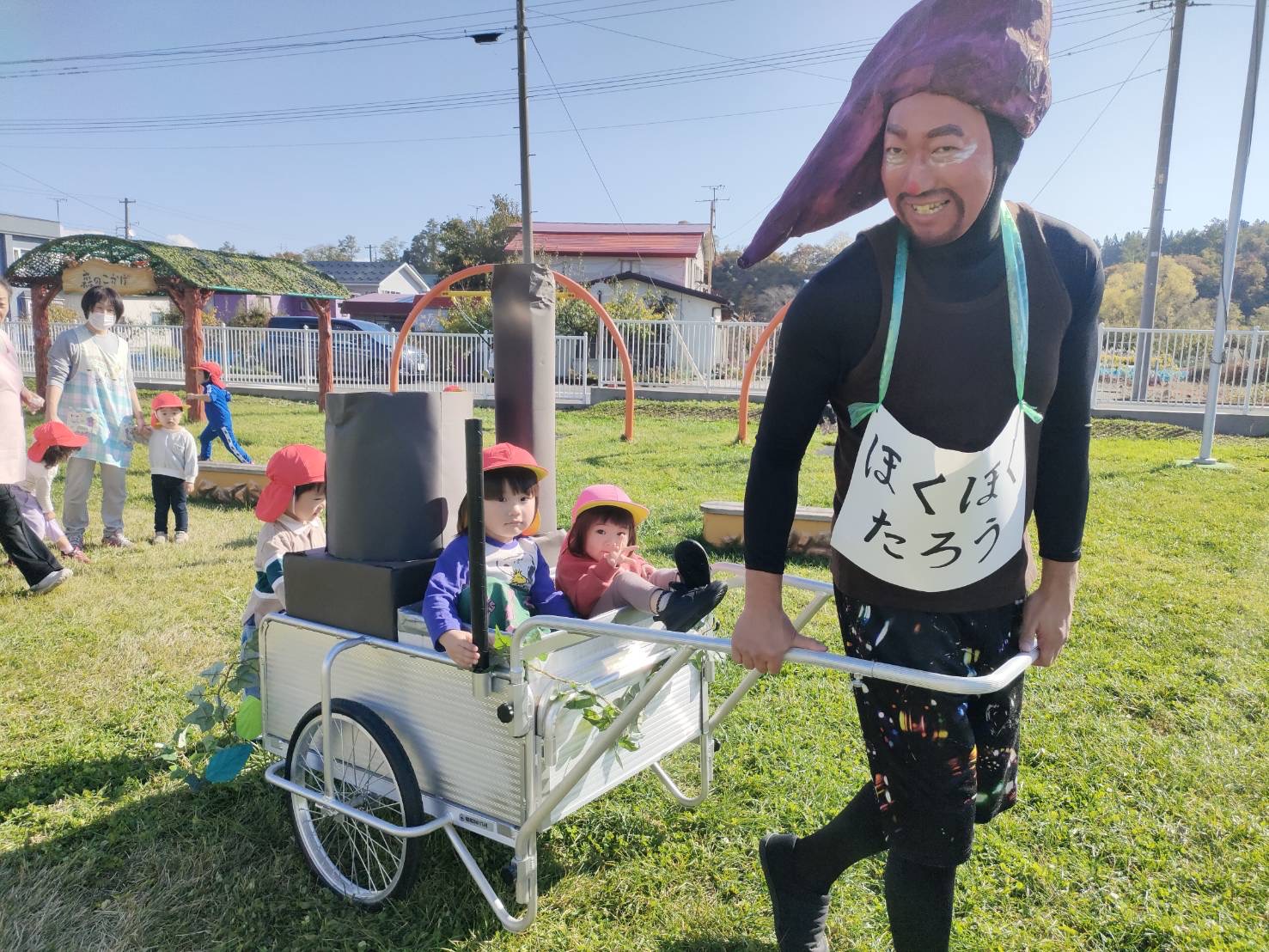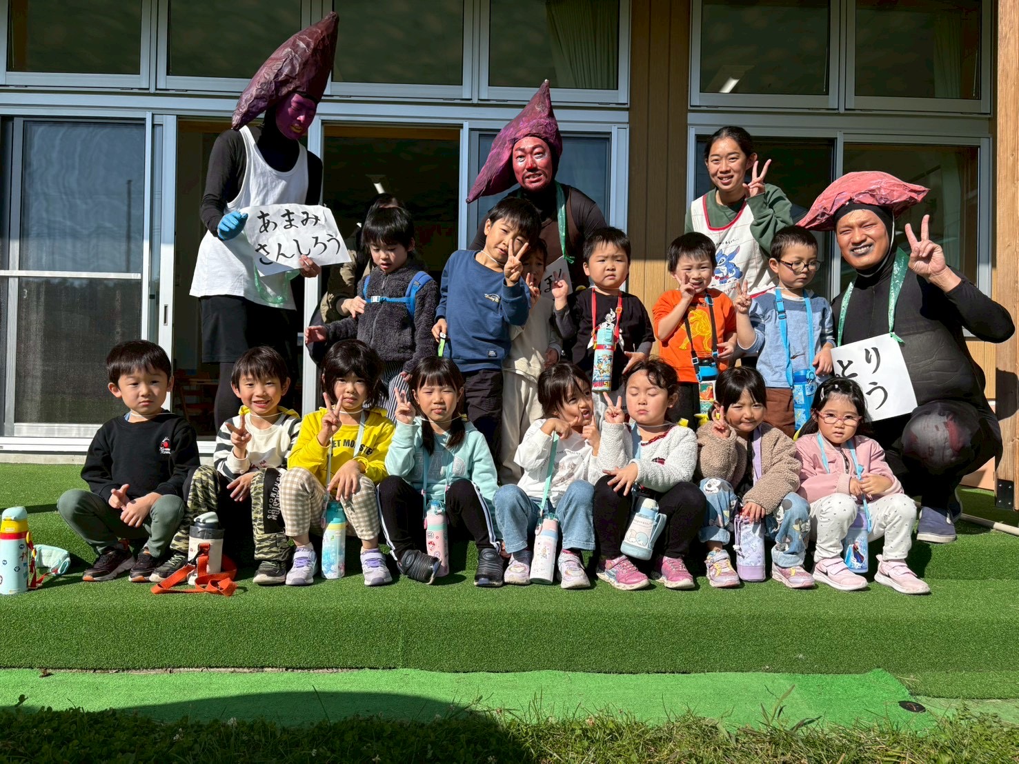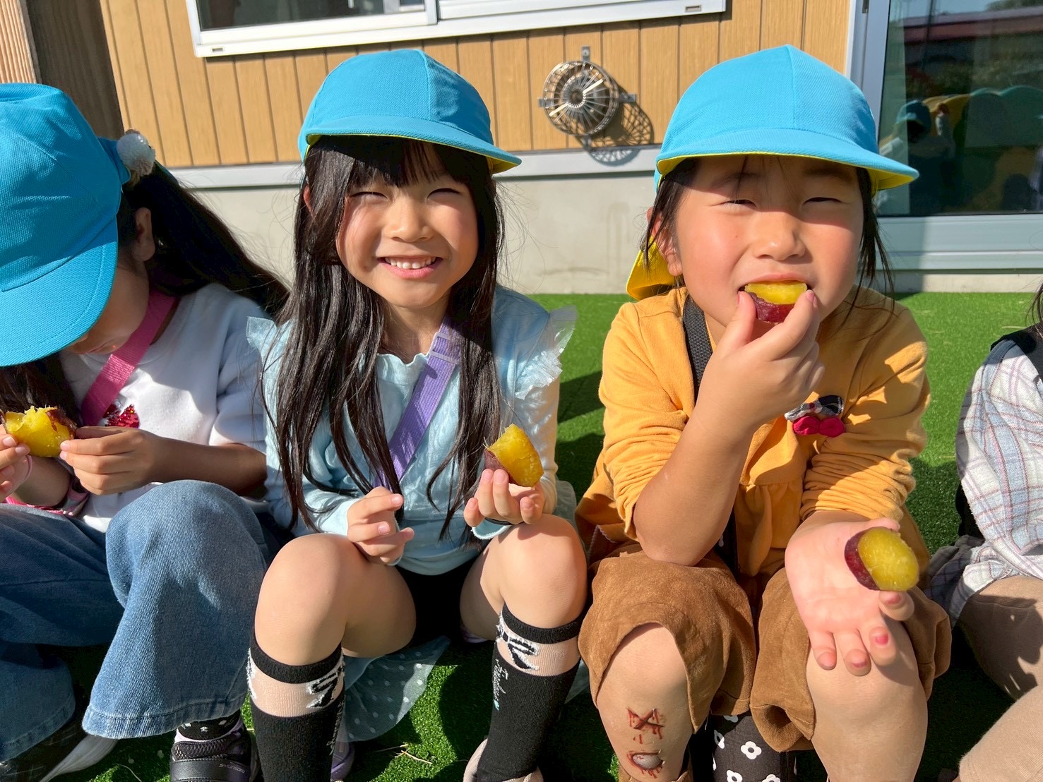 毎年恒例の焼き芋集会がやってきました。今回は焼き芋三太郎というキャラクターが現れ、芋ほりと題し、綱引き対決を楽しみました。そして、ポカポカな陽気の中、美味しい焼き芋をみんなでパクリ!「美味しい!おかわりしたい!」と喜びいっぱいの子ども達でした。 |