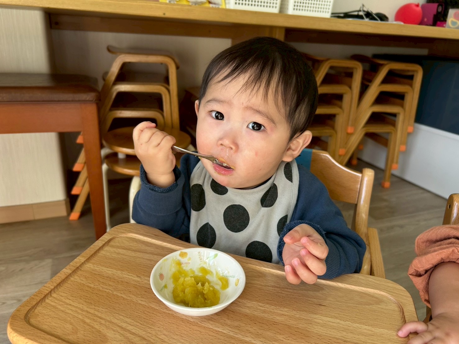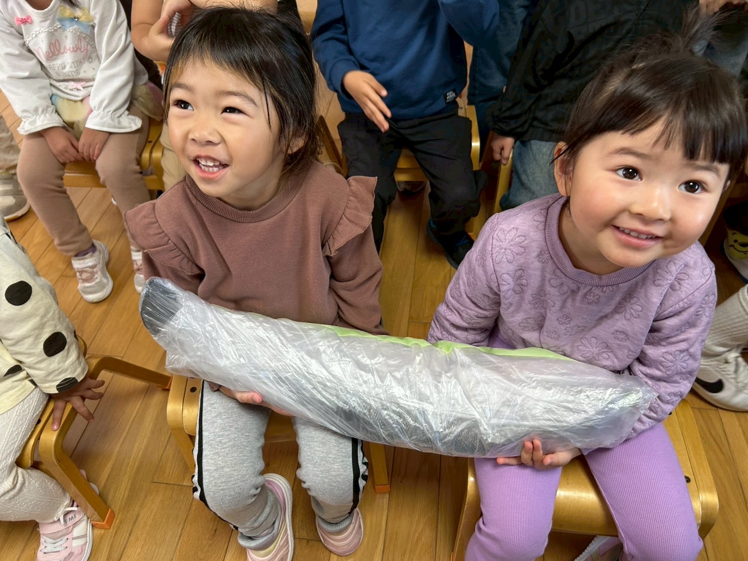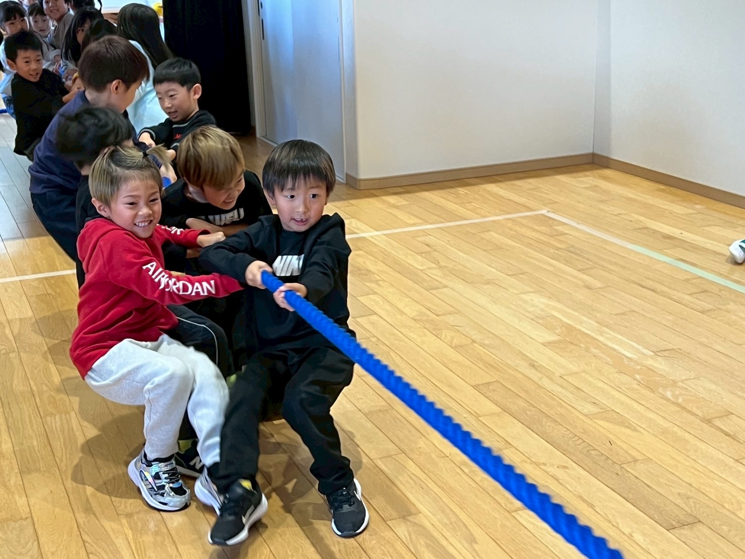 毎年恒例の焼き芋集会がやってきました。今回は焼き芋三太郎というキャラクターが現れ、芋ほりと題し、綱引き対決を楽しみました。そして、ポカポカな陽気の中、美味しい焼き芋をみんなでパクリ!「美味しい!おかわりしたい!」と喜びいっぱいの子ども達でした。 |