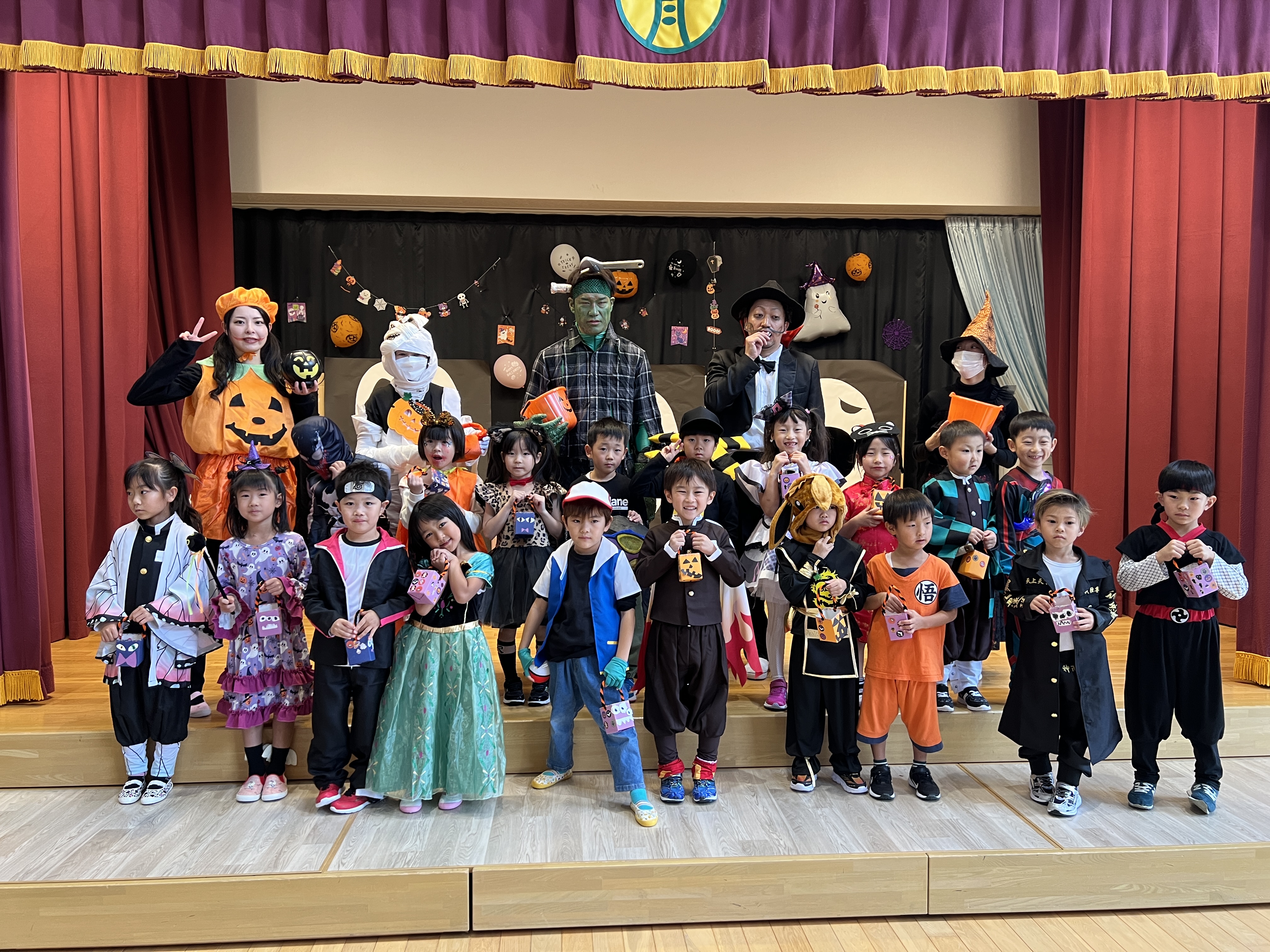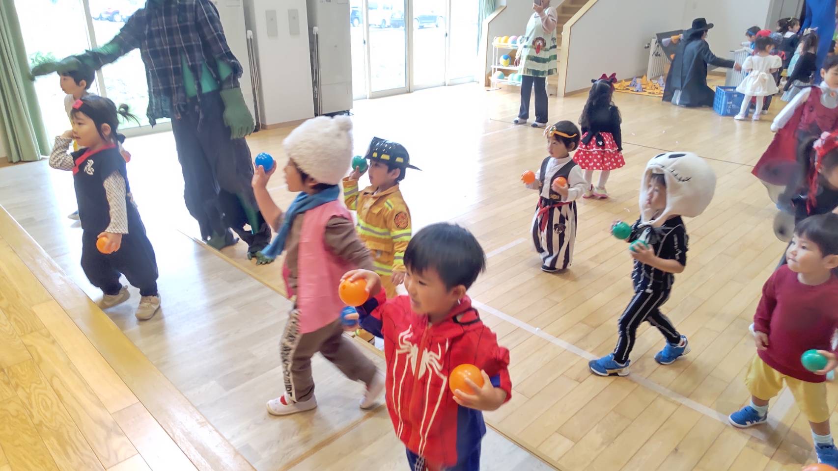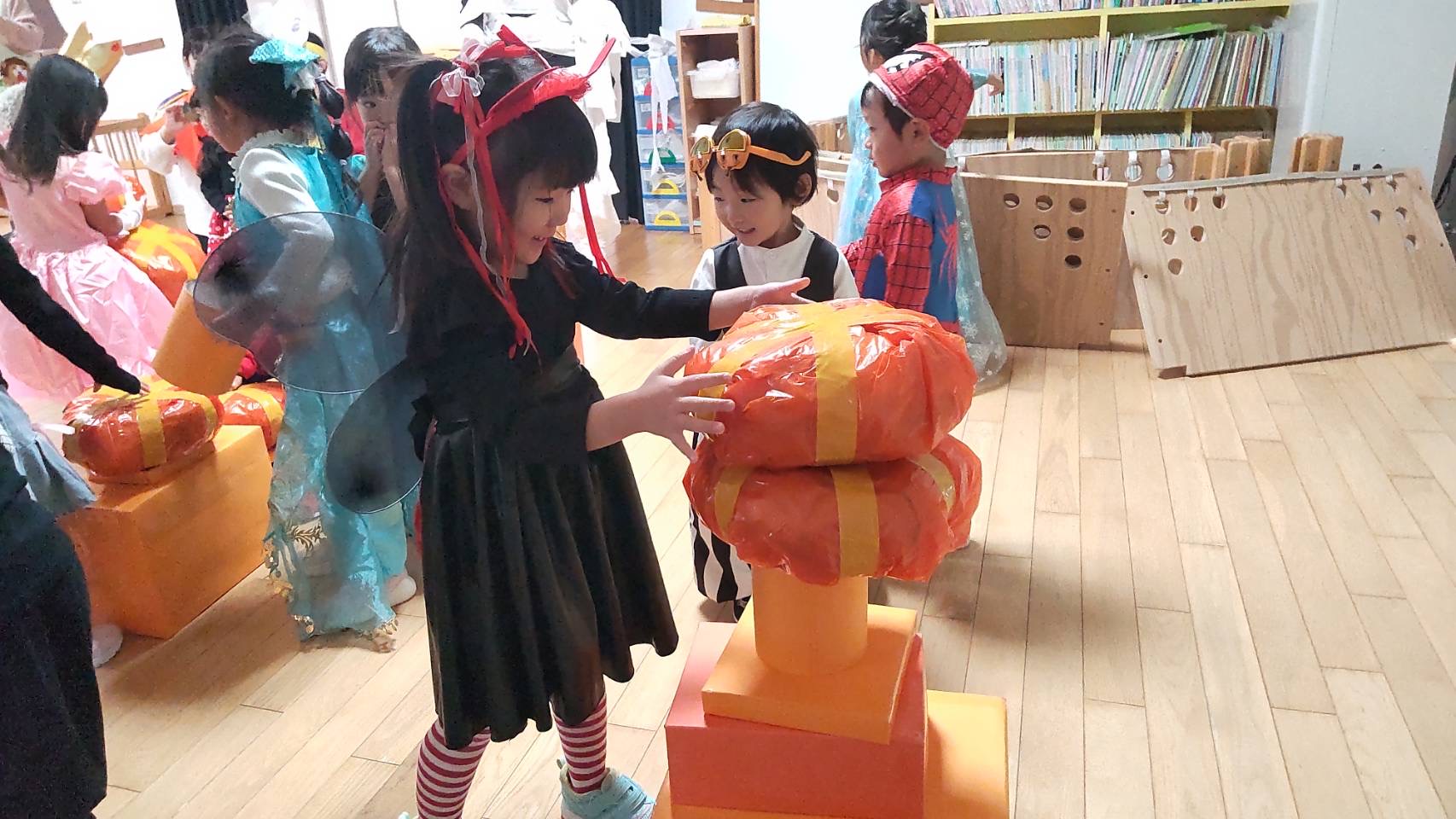 | 待ちに待ったハロウィンパーティーの日。それぞれ好きな仮装をして登園し、いつもよりハイテンションな様子の子ども達。パーティーでは、みんなで踊ったり、ゲームコーナーで遊んだり、とても楽しんでいました。最後に『トリックオアトリート!!』でお菓子を貰って、とてもうれしいハッピーな気分の一日となりました。 | ||