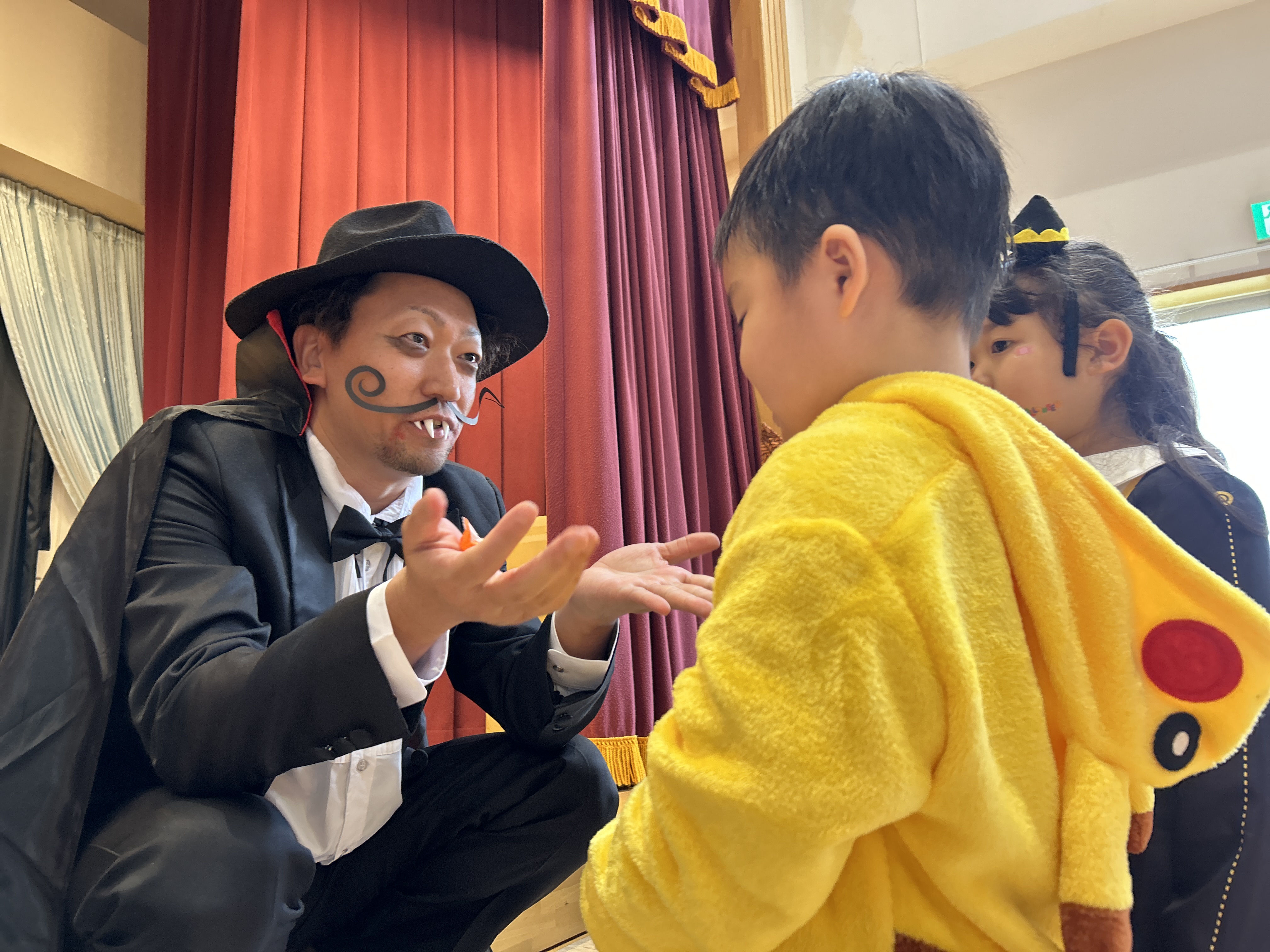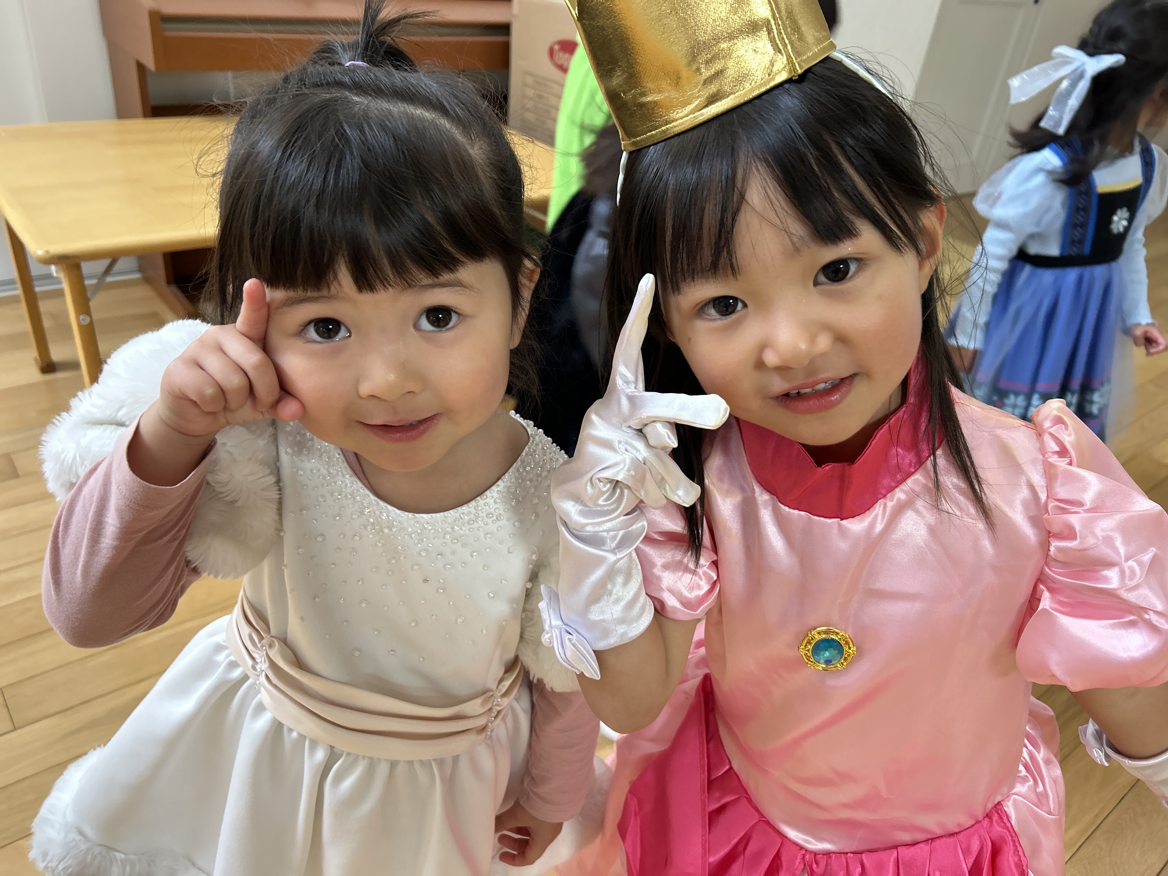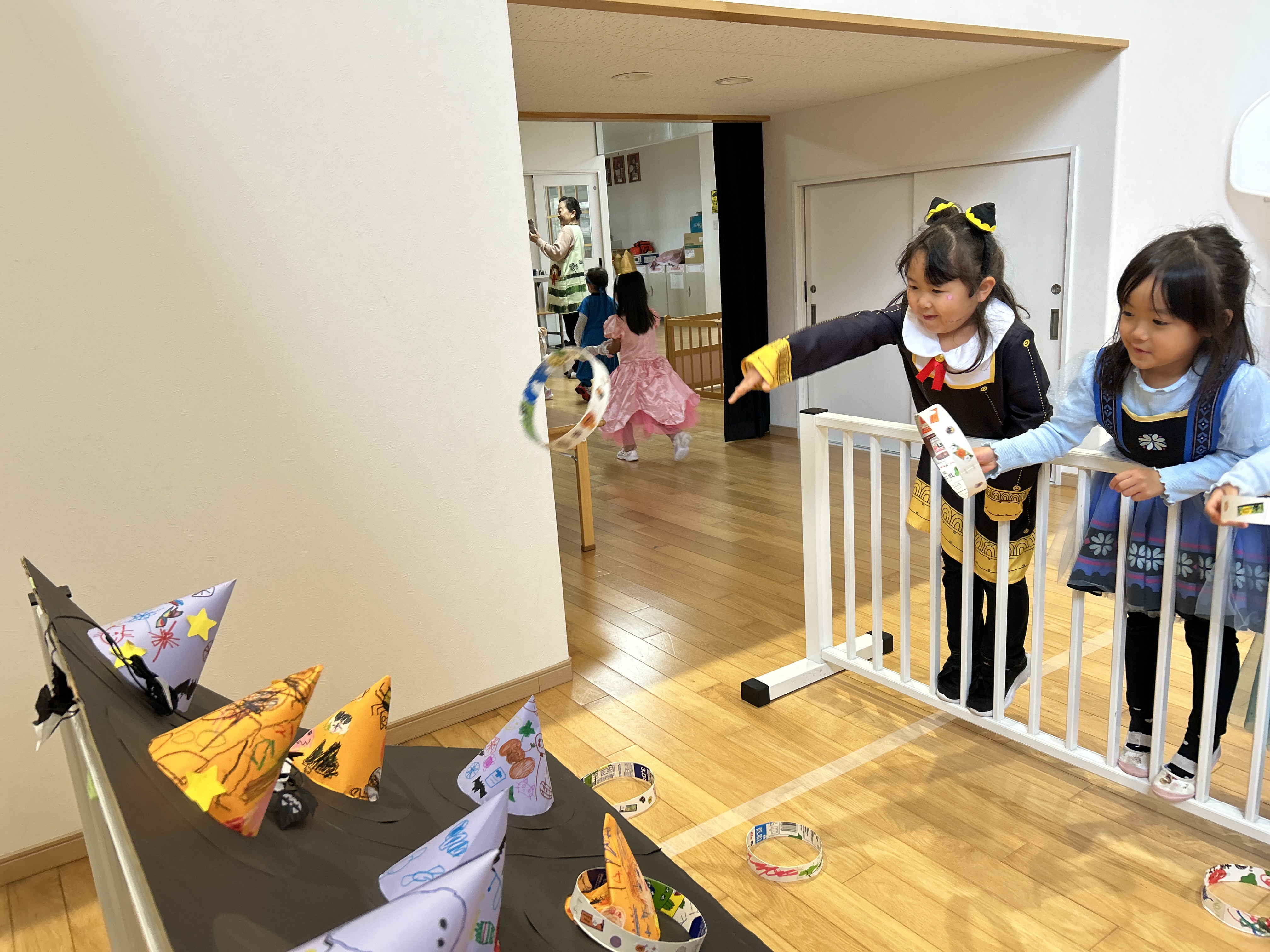 | 待ちに待ったハロウィンパーティーの日。それぞれ好きな仮装をして登園し、いつもよりハイテンションな様子の子ども達。パーティーでは、みんなで踊ったり、ゲームコーナーで遊んだり、とても楽しんでいました。最後に『トリックオアトリート!!』でお菓子を貰って、とてもうれしいハッピーな気分の一日となりました。 | ||