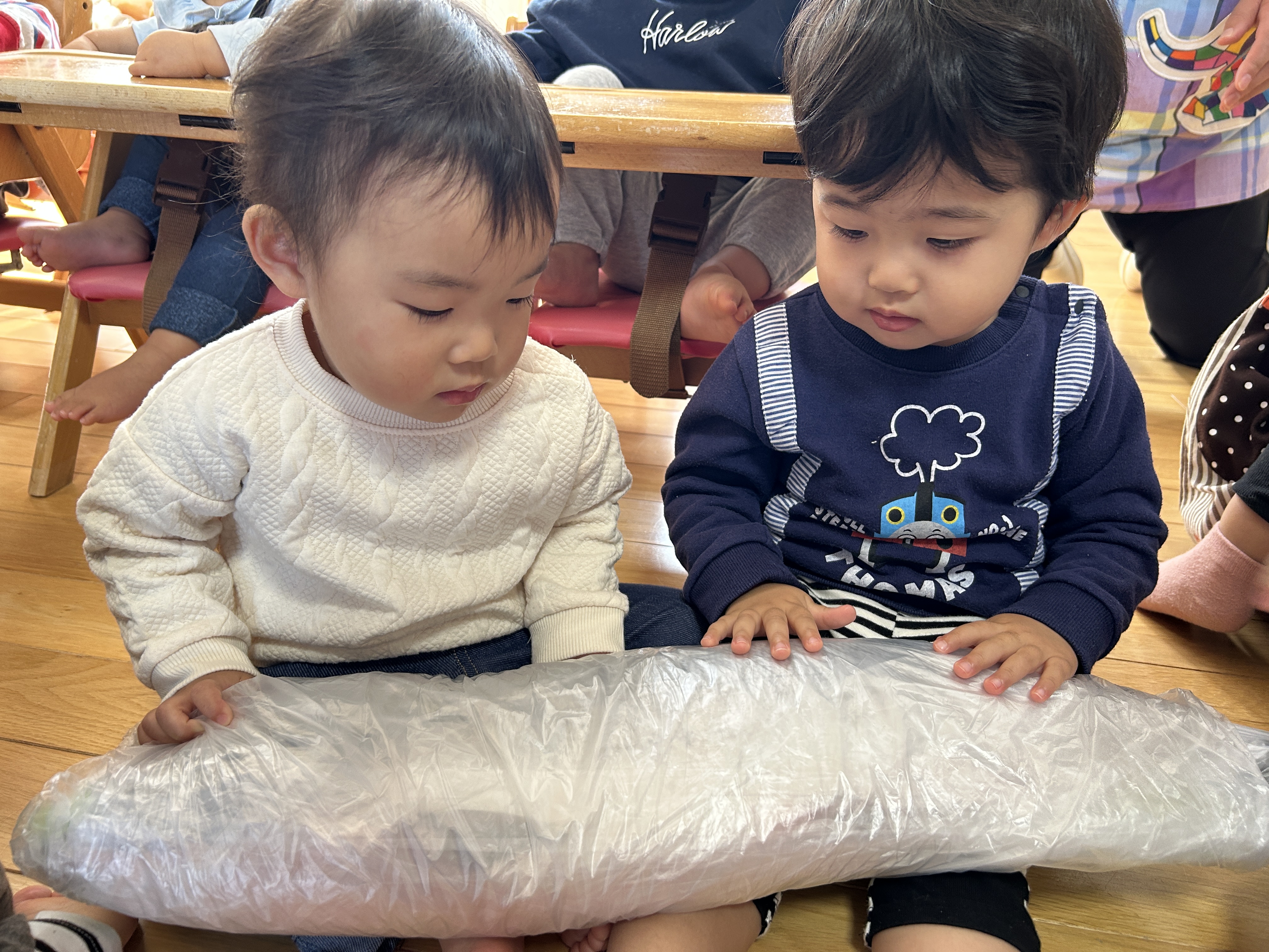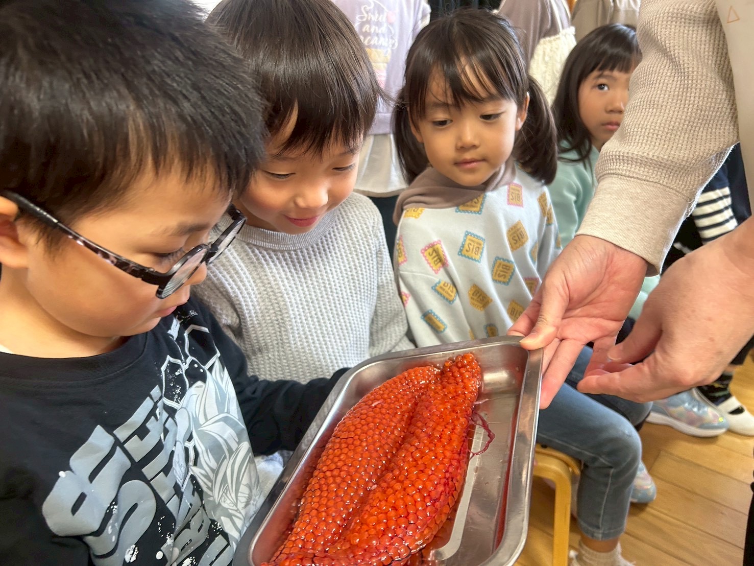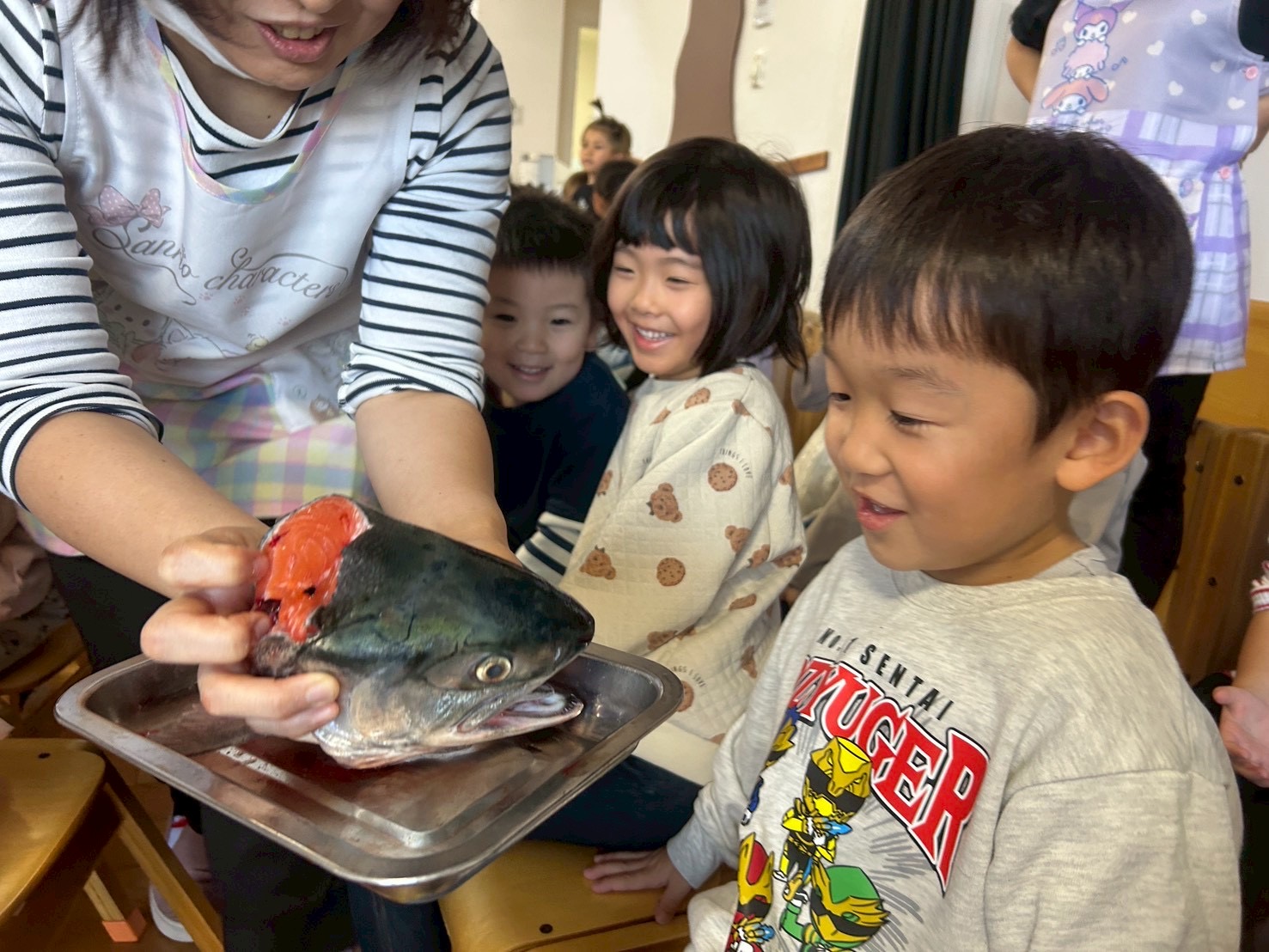 食育集会にて、鮭の解体ショーが開かれました。鮭の捌かれた身や頭、卵を見て、興味津々の子ども達。実際に鮭を持ち、重さを感じてみる体験もしました。命を頂くことの大切さを皆で学んだ一日となりました。 |