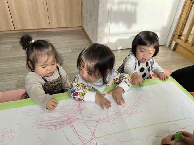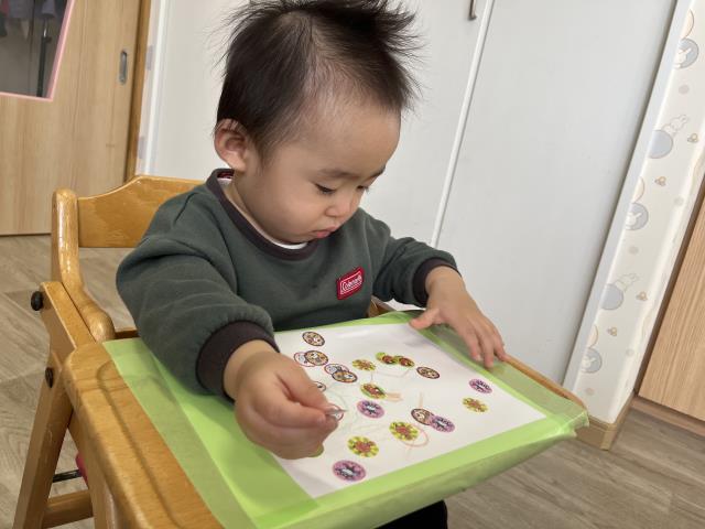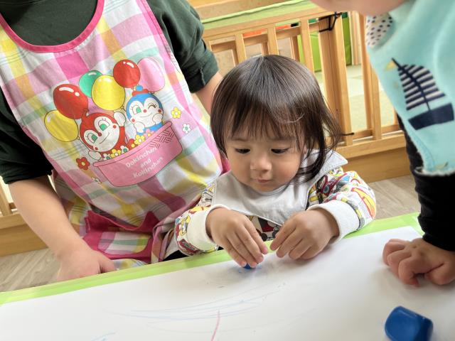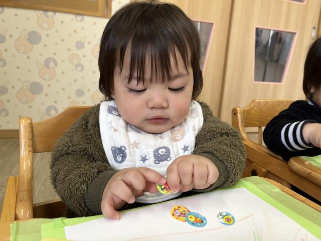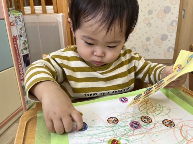 | 石ころのようなクレヨンを持って、好きなようにお絵描きを楽しみました。小さな手で一生懸命書こうとする姿がとてもかわいらしいひよこ組のみんなでした。シール貼りにもチャレンジして上手にペタペタ貼ることができました。 | ||